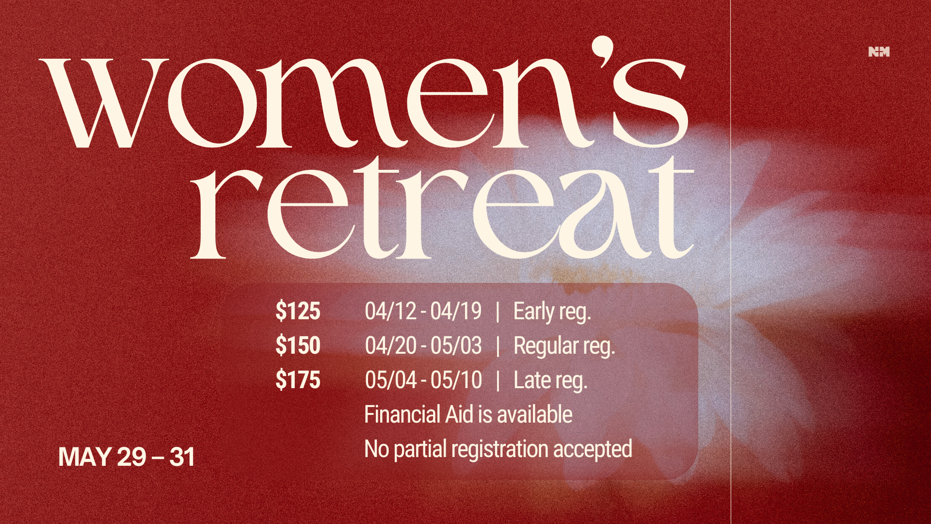 Financial aid is available upon request. Please reach out to Pastor Lisa Yu at lisa@newmercy.church for more information.